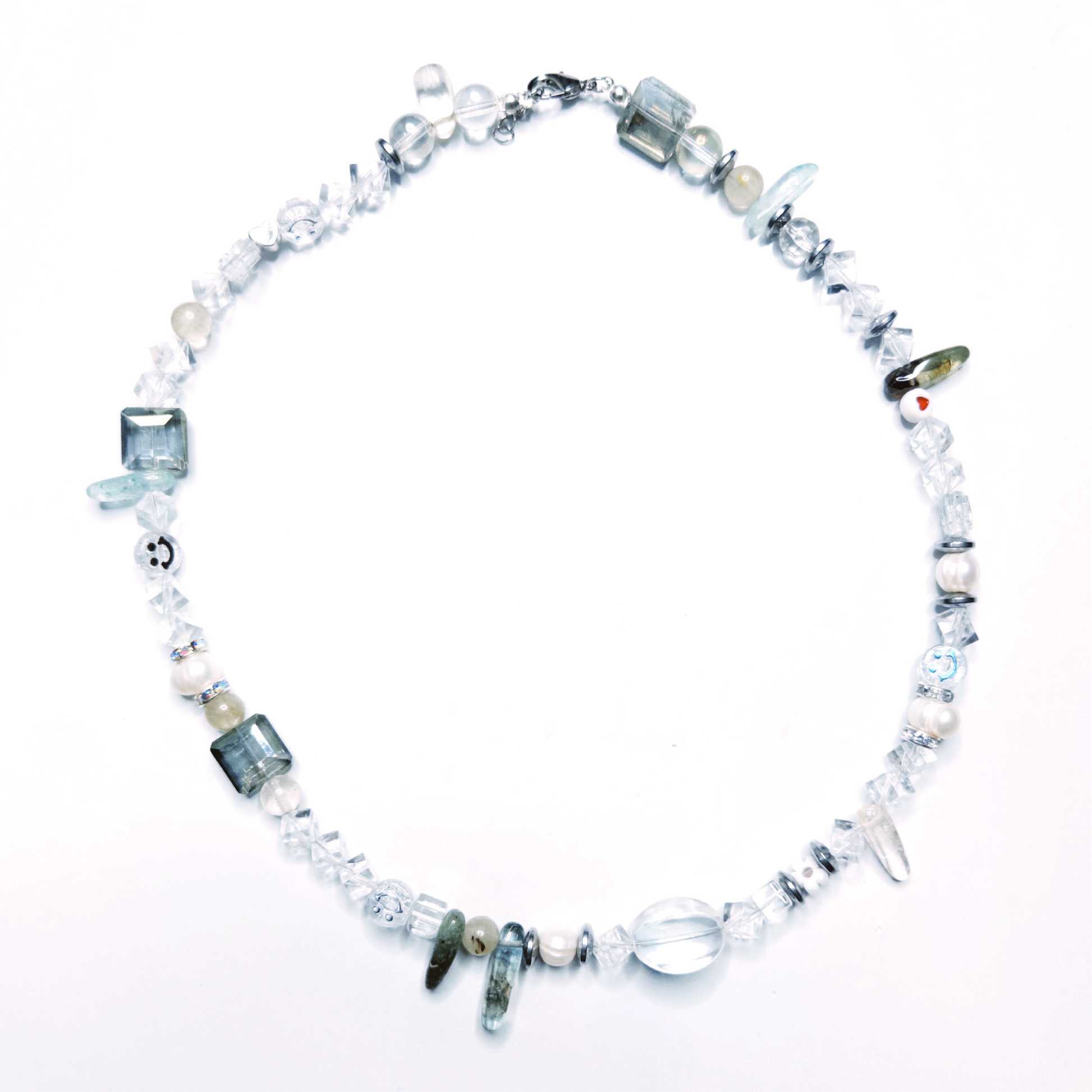 Handmade single layer adjustable fashion statement necklace with resin, freshwater pearl, smiley, rhinestone spacers, quartz, hematite, glass, and artificial accessories.