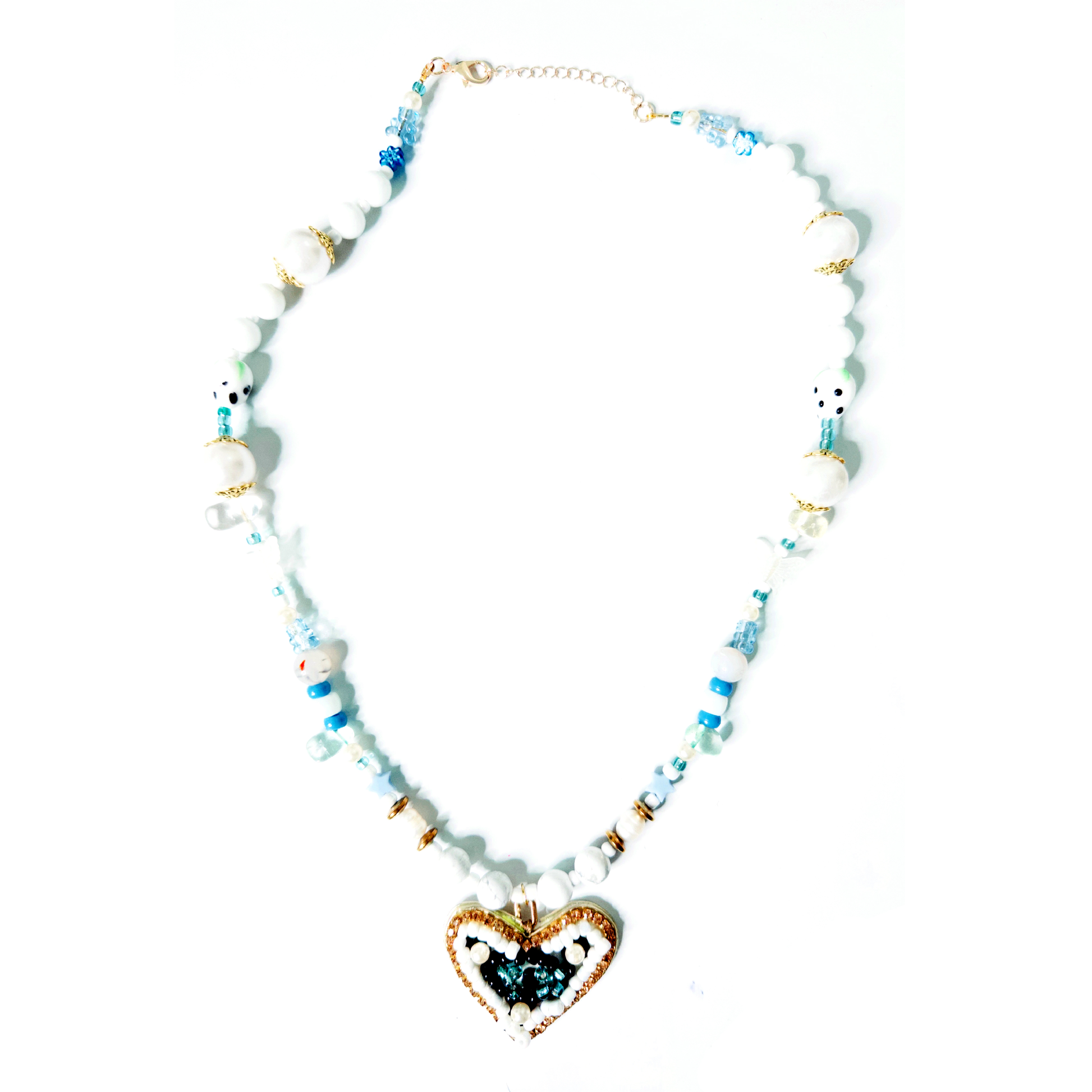Blue and White African hand-embroidered eye in heart pendant with adjustable statement necklace combination of artificial beads, lampwork strawberries, faux leather, glass, pearl, and stone beads.