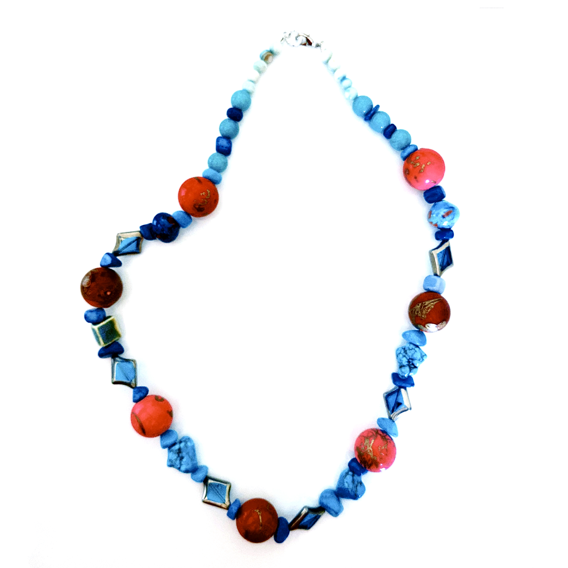 Long statement African handmade beaded necklace with blue stone beads, glass, shell, painted wood, and artificial beads.